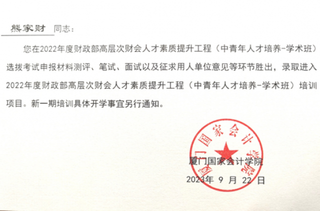 近日,2022年度财政部高层次财会人才素质提升工程(中青年人才培养——学术类)选拔工作结束,经过申报材料审核、笔试、面试等环节,会计学院院熊家财教授成功入选。