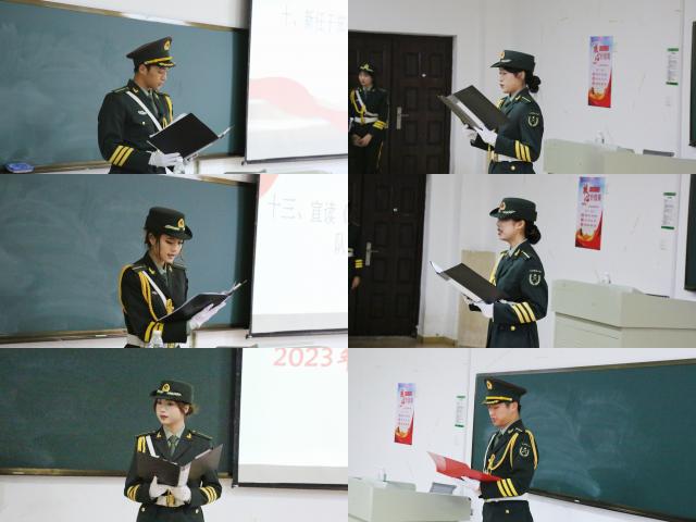 蔡文韬主持交接仪式,历任干部将国旗、队旗庄严地交到新任支书和大队长手上,新生代表接过军礼服。孟健分享自己在国旗护卫队的工作经历,对国旗护卫队的未来发展提出建议;大队长邱爽作2022-2023学年工作总结;新任大队长丁雪彬作2023-2024学年国旗护卫队工作展望;新任副大队长权佳乐宣读部门、中小队干部名单;新任副大队长李婧主持新队员入队仪式,带领新队员宣誓并签订《江西财经大学国旗护卫队入队承诺书》;新任副大队于子涵宣读《江西财经大学国旗护卫队章程(2023年修订版)》。支书王子贺、小队长黄彦臻、队员王若楠分别作为优秀获奖代表、骨干干部代表及新生代表进行发言。