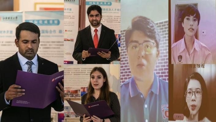 书卷飘香,才艺绽放。开营仪式上,我校艺术学院罗时武教授以书法表演为活动开笔;艺术学院宋韵佳、雷敏老师带来的乐器演奏为全场增添了浓浓的中国韵味;来自越南阮必成大学、老挝仰光师范大学和我校的3位学员分享了自己与汉语结缘的故事,缘识汉语,爱上汉语;我校2名巴基斯坦、1名俄罗斯留学生还分别以中国传统节日为背景,用中文朗诵古诗,他们的朗诵,抑扬顿挫,诗韵拿捏恰好好处,赢来掌声连连......