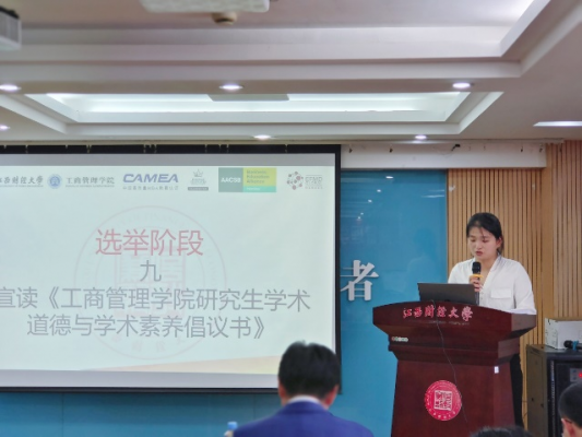 第十二届研分会主席姜小迁在大会上做了工作报告。王菲作为新一届研分会干部代表在会上发言。大会进行了研究生分会授旗仪式。新一届届学术部部长施美兰带领全体参会学生宣读了《工商管理学院研究生学术道德与学术素养倡议书》。