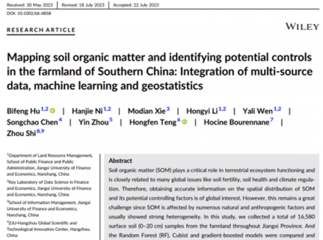 题为《Mapping soil organic matter and identifying potential controls in the farmland of Southern China: Integration of multi-sources data, machine learning and geostatistics》的论文发表在地球科学与土地科学领域国际知名期刊《Land Degradation &Development》。