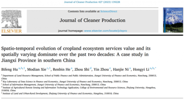 其中题为《Spatio-temporal evolution of cropland ecosystem services value and its spatially varying dominate over the past two decades: A case study in Jiangxi Province in Southern China》的论文发表在环境科学与生态学领域国际知名期刊《Journal of Cleaner Production》。