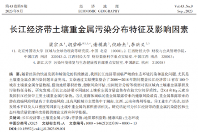 题为《长江经济带土壤重金属污染空间分布特征及影响因素分析》的论文发表在地理科学领域国内一流期刊《经济地理》。论文整合了2008—2018年期间覆盖长江经济带11省市100个城市土壤重金属含量数据,借助地质累积指数、健康风险评估、空间统计分析等模型进行该区域内土壤重金属累积及污染特征分析。研究发现:长江经济带不同地区土壤重金属含量富集存在较大空间异质性。Cd和Hg元素为我国长江经济带主要土壤重金属污染物。儿童群体面临的重金属暴露带来的健康风险最高,重金属暴露带来的潜在致癌风险明显高于非致癌风险,且高风险城市主要集中于湖南、江西、云南和贵州等地。工业生产活动,经济发展水平以及人口密度等因素与土壤中重金属的累积密切相关。研究结果可为长江经济带的重金属污染防控和生态环境质量管理和改善提供理论支撑和科学依据。