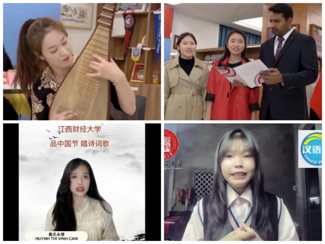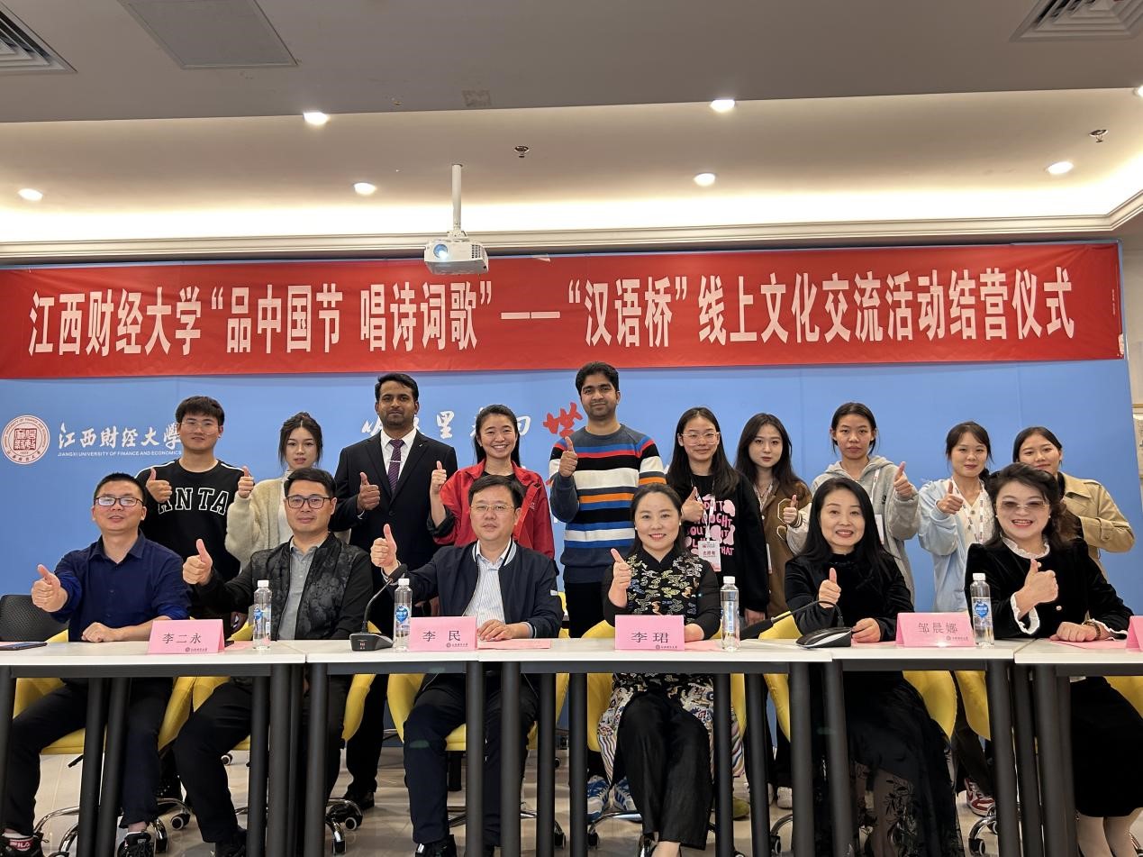 11月9日下午,由教育部中外语言交流合作中心主办、江西财经大学承办的“品中国节 唱诗词歌”——“汉语桥”线上文化交流项目结营仪式在我校蛟桥园图书馆二楼国际化展厅举行。出席本次活动的有江西财经大学艺术学院院长李民教授、艺术学院副院长李二永教授、“品中国节唱诗词歌”项目负责人李珺博士和项目组团队教师、越南雒鸿大学中文系主任潘世英以及来自越南、印度尼西亚、蒙古国、埃塞俄比亚等11个国家的近600名学员。结营仪式由项目负责人李珺博士主持。