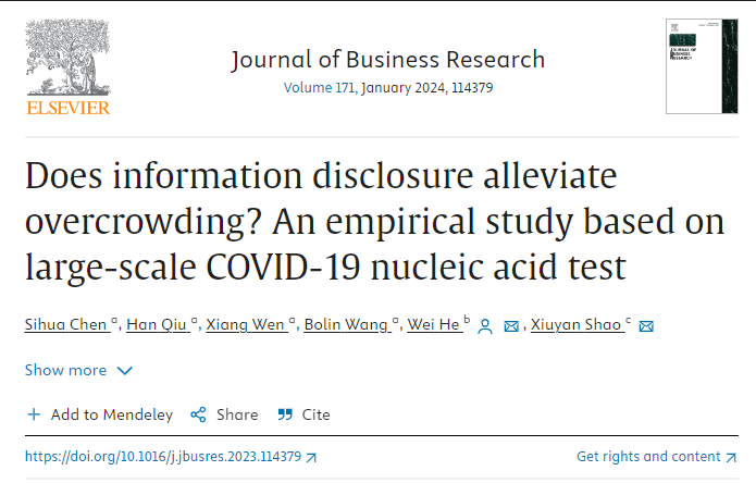 近日,信息管理学院陈思华教授及其科研团队成员博士研究生邱焓、硕士研究生温祥、王博林的研究成果被《Journal of Business Research》期刊录用并发表,该论文题目为“Does information disclosure alleviate overcrowding? An empirical study based on large-scale COVID-19 nucleicacidtest”。参与该研究的还有工商管理学院的何炜教授,南京市玄武区科技局副局长、东南大学经济管理学院教师邵秀燕等学者。