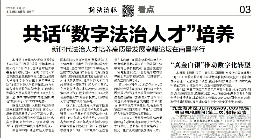近日,《新法治报》03版刊登“共话‘数字法治人才’培养——新时代法治人才培养高质量发展高峰论坛”在南昌举行,对我校在百年校庆之际,举办“新时代法治人才培养高质量发展高峰论坛暨江西财经大学法学专业创办三十周年庆典活动”进行了详细报道。