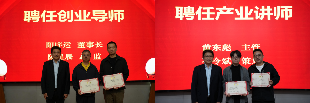 廖国琼为阳序运、陈星辰颁发创业导师聘书,为黄东彪、孔令斌颁发产业讲师聘书。