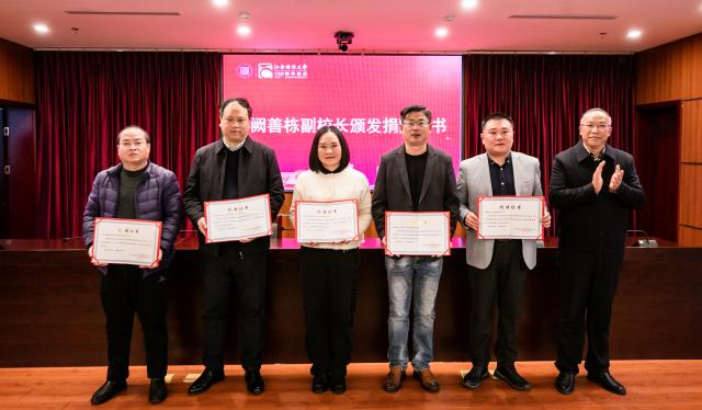 袁雄代表学校依次与捐赠方代表签约并接受捐赠支票。