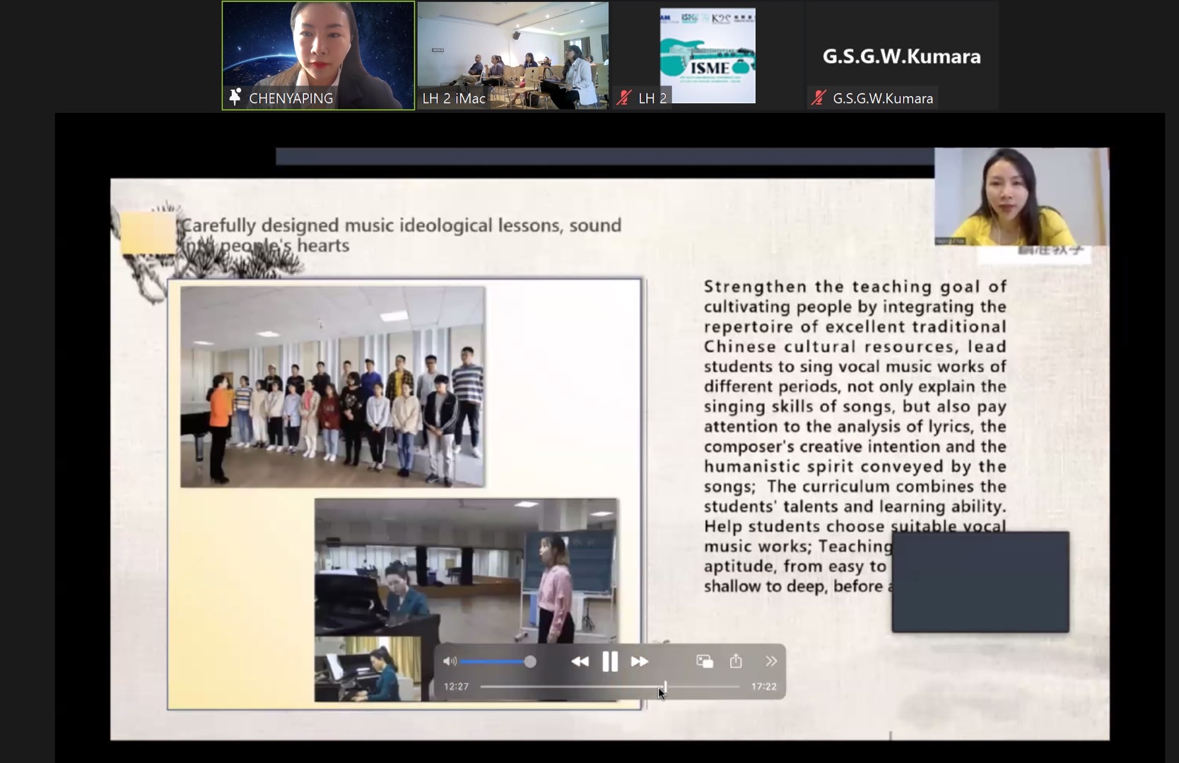陈雅萍此次申请了线上会议展示,展示的主题:中国民歌演唱教学的社会文化作用研究。陈雅萍介绍中国是一个具有五千年历史的国家,五千年文明,三千年诗韵,而诗与歌有着紧密联系。同时,中国有着56个民族,多姿多彩的民族文化滋养出形式多样的民族音乐文化,产生了独具特色的地方民歌。并介绍到中国现代声乐的发展是在中国传统与现代、中西声乐艺术的碰撞与交融中进行的。同时,还向参会人员介绍了我校声乐课程的培养目标、设置、内容及相关研究成果。(图文/林舒欣 编辑/李贵超 审核/一审 姜莹 二审 赵旻 终审 李大晖)
