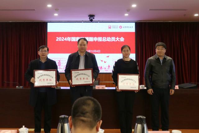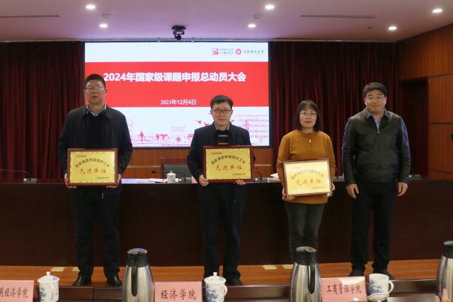 邓辉为应用经济学院、经济学院、统计与数据科学学院颁发“2023年度国家课题申报组织工作先进单位”奖项,为工商管理学院、人文学院、信息管理学院颁发“2023年度国家课题申报组织工作优秀单位”奖项。