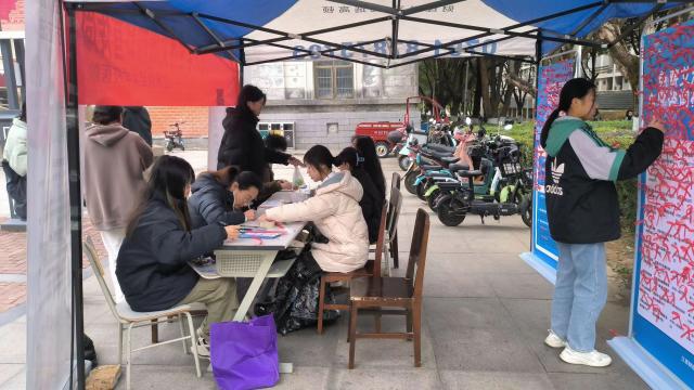仪式结束后,宣传周活动在蛟桥园校区大礼堂前、麦庐园校区十二生肖广场正式拉开帷幕,按时间次序分三个项目进行。1日至2日,“拥抱爱,推开艾”活动摆设线下宣传物资,同学们进行拍照打卡并发布到QQ空间中集赞,助力防艾宣传。活动热度节节高升,线下同学拍照的身影络绎不绝,线上空间防艾宣传海报随处可见,为更多人带来“艾”的教育。3日至4日,“纸短情长,凝聚‘艾’意”活动在线下准备了防艾宣传展板,同学们在纸条上写下对患艾滋人群的祝福或艾滋病相关知识,并将纸条折成防艾宣传标识“红丝带”样式,粘贴在宣传展板上。丝丝红带联结着同学们的美好祝愿,成为冬日暖阳下的一道风景线。6日至7日,“以‘艾’作问,‘答艾’无边”活动准备了与艾滋病知识有关的问题。同学们进行作答后,志愿者对答案进行判读并解释,以增强同学们对艾滋病的正确认知。