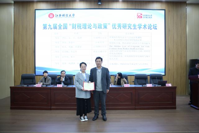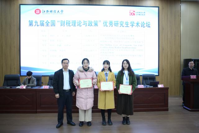 开幕式上举行了优秀论文颁奖仪式。袁红林为一等奖作者上海财经大学尹玲博士颁奖;教育部财政学专业教学指导委员会委员、西安交通大学经济与金融学院宋丽颖教授为二等奖作者山东大学李真博士、江西财经大学曾鑫博士颁奖;浙江财经大学财政税务学院副院长高琳副教授为三等奖作者西安交通大学薛青梅博士、湖南大学范贤贤博士、武汉大学钱津津博士颁奖。