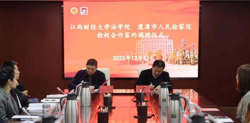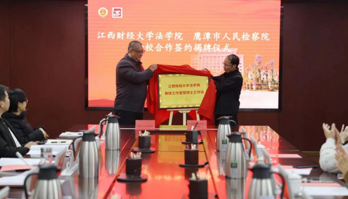 12月12日上午,法学院与鹰潭市人民检察院在鹰潭市人民检察院四楼检委会会议室(409)举行检校合作签约仪式,并为“江西财经大学法学院教授工作室暨博士工作站”揭牌。