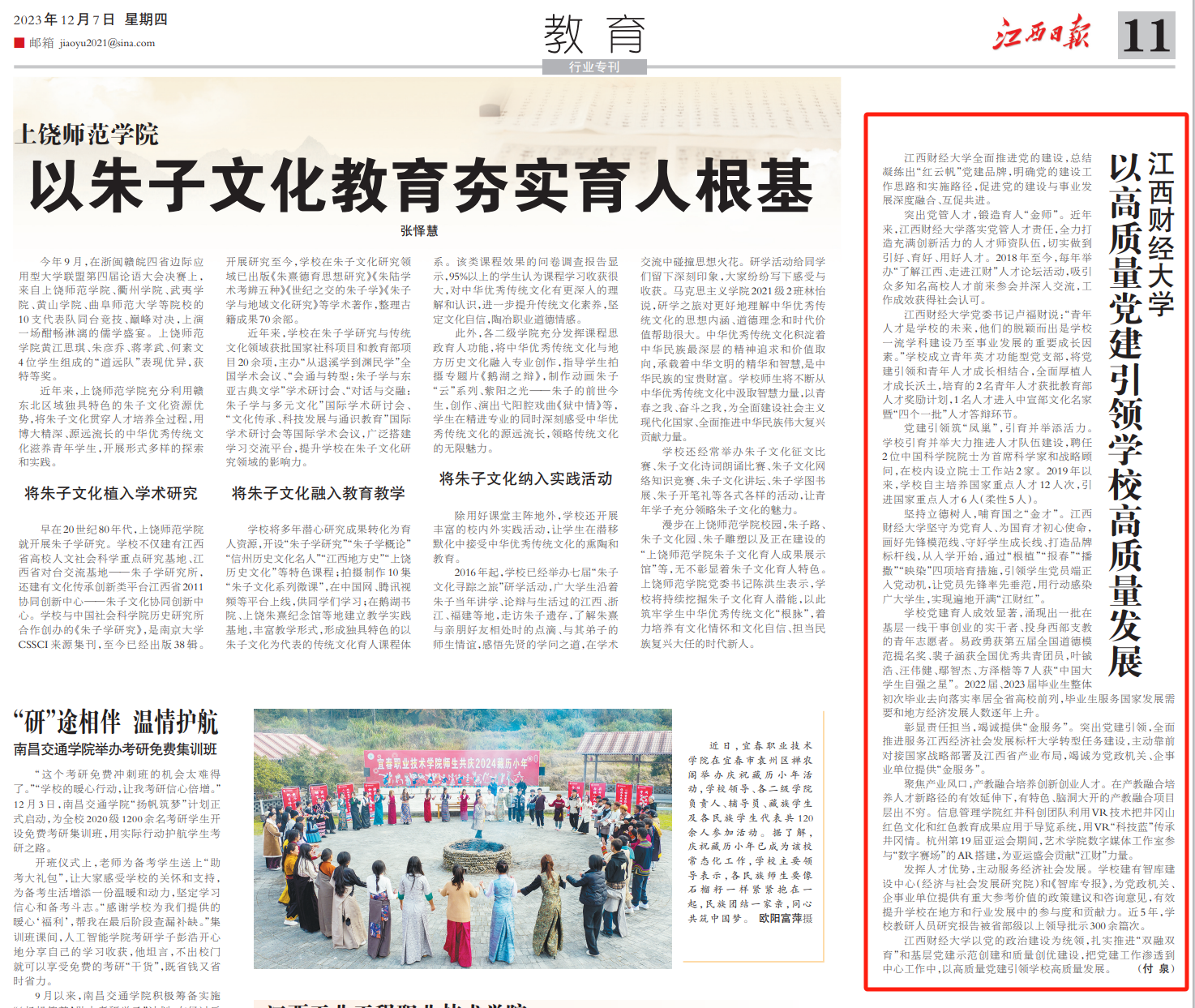 近日,《江西日报》以“江西财经大学:以高质量党建引领学校高质量发展”为题,报道我校全面推进党的建设,促进党的建设与事业发展深度融合、互促共进。