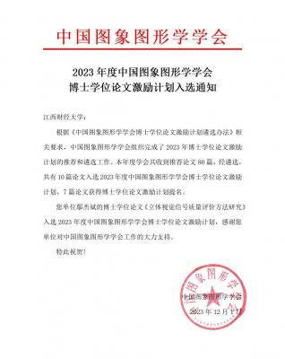 近日,信息管理学院青年教师鄢杰斌博士的博士论文《立体视觉信号质量评价方法研究》入选2023年度中国图象图形学学会博士学位论文激励计划。全国共10篇论文入选博士学位论文激励计划,7篇论文获得博士学位论文激励计划提名。