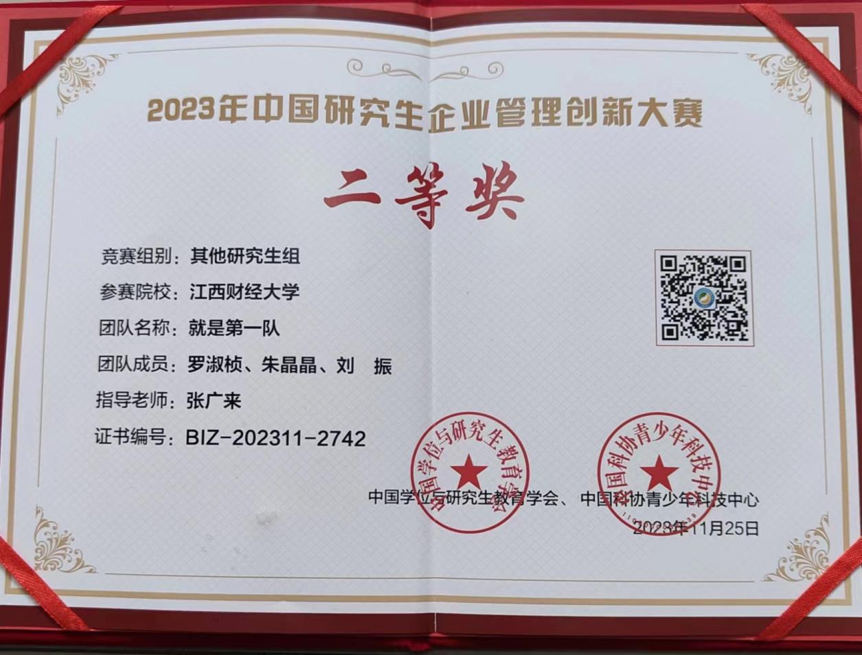 11月25日,2023年中国研究生企业管理创新大赛总决赛在上海大学举行。经济学院资产评估专业硕士罗淑桢、朱晶晶、刘振、三位同学组成“就是第一队”团队,在指导老师张广来的带领下,从全国2122支队伍中脱颖而出,最终获得全国二等奖。