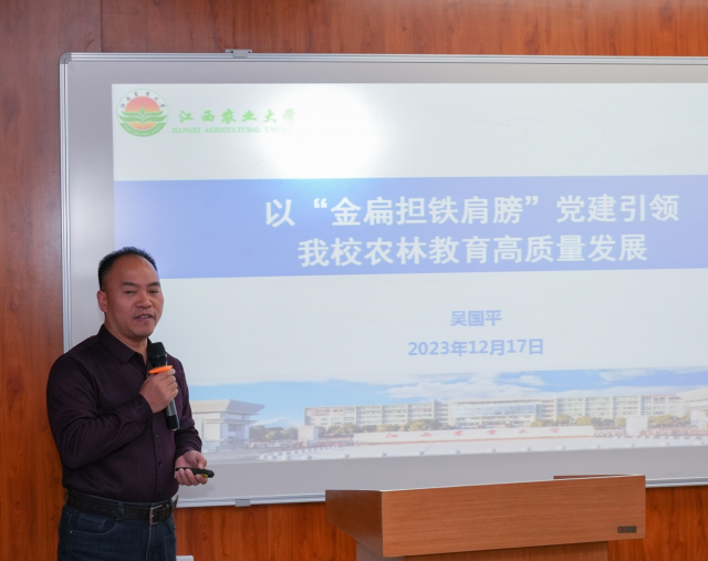 江西农业大学教务处党支部书记、教务处处长吴国平以“以‘金扁担铁肩膀’党建引领我校农林教育高质量发展”为题作专题报告。报告分别从新时代赋予农林教育新使命、农林教育拔尖创新人才培养面临新挑战、拔尖创新人才自主培养的“江农”探索与实践3个方面进行阐述,提出农林教育要主动服务于国家战略需求,要加快拔尖创新人才的自主培养。