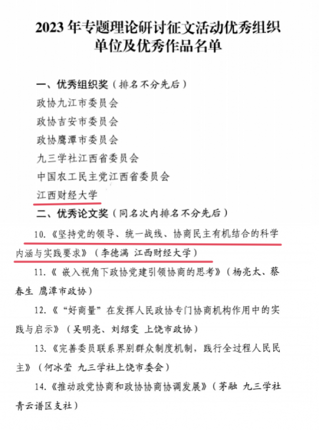 近日,政协江西省委会办公厅、江西省人民政协理论研究会发文,表扬2023年度专题理论研征文活动优秀组织单位和优秀论文。我校获评优秀组织奖并被通报表扬,马克思主义学院李德满的《坚持党的领导、统一战线、协商民主有机结合的科学内涵与实践要求》获评优秀论文奖三等奖。