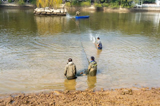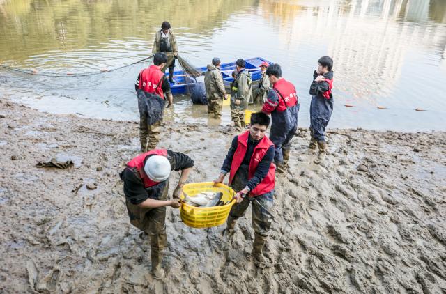 “起网捕鱼!”伴随着各位师生的掌声与喝彩,捕捞工作在现场师生的见证下正式开始。专业捕捞队下水撒网,同学生志愿者们一起进行捕捞。