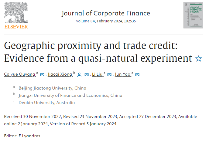 近日,会计学院熊家财教授的研究成果发表于公司金融领域国际顶尖期刊Journal of Corporate Finance的2024年第84卷,论文题目为“Geographic Proximity and Trade Credit: Evidence from a Quasi-natural Experiment”,熊家财为论文第二作者及通讯作者,论文合作者为北京交通大学欧阳才越副教授、澳大利亚Deakin大学Li Liu和Jun Yao教授。