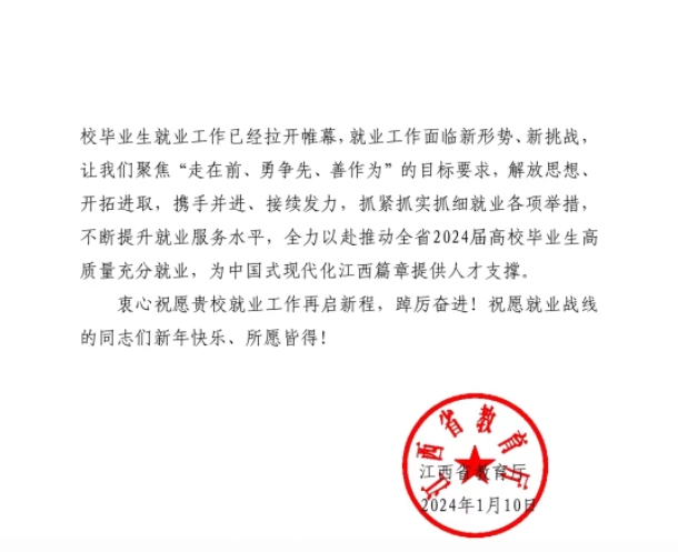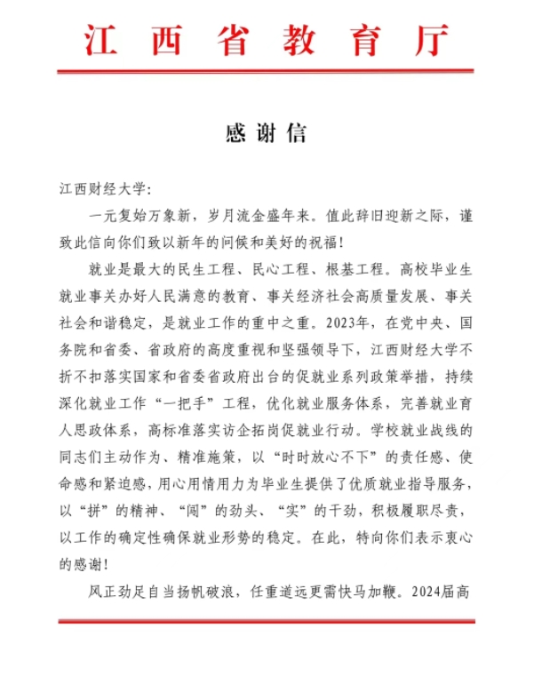 信中指出,2023年,在党中央、国务院和省委、省政府的高度重视和坚强领导下,江西财经大学不折不扣落实国家和省委、省政府出台的促就业系列政策举措,持续深化就业工作“一把手”工程,优化就业服务体系,完善就业育人思政体系,高标准落实访企拓岗促就业行动。学校就业战线的同志们主动作为、精准施策,以“时时放心不下”的责任感、使命感和紧迫感,用心用情用力为毕业生提供了优质就业指导服务,以“拼”的精神、“闯”的劲头、“实”的干劲,积极履职尽责,以工作的确定性确保就业形势的稳定。