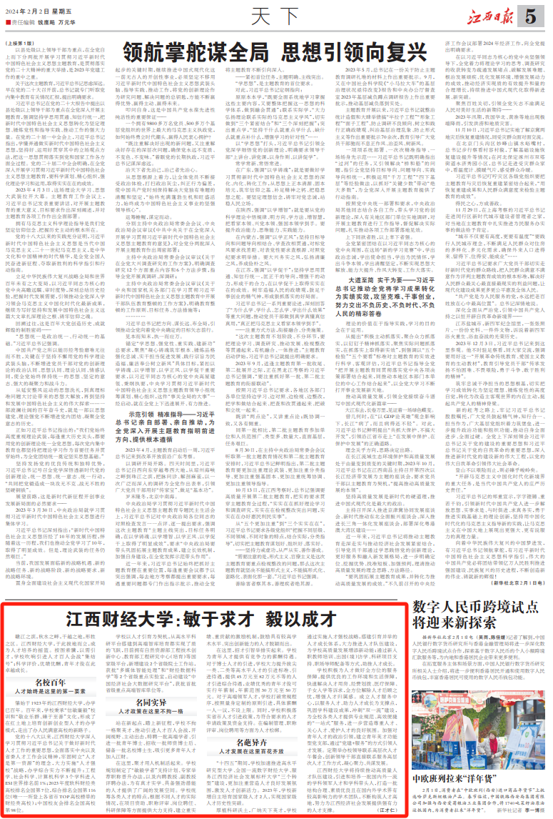 2月2日,《江西日报》以“江西财经大学:敏于求才毅以成才”为题,报道我校搭建引育并举的人才成长体系,大力推进人才队伍建设,科学评价,优绩优酬,为学校高质量发展增添新动能。