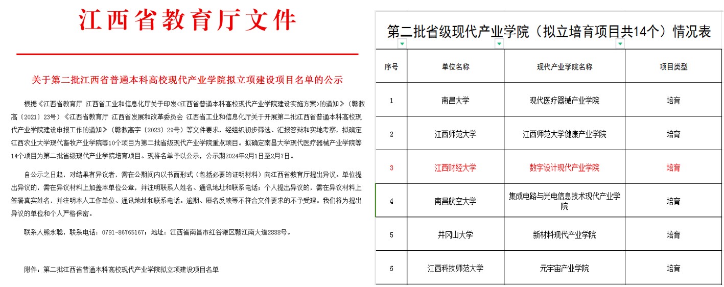 近日,江西省教育厅发布了《关于第二批江西省普通本科高校现代产业学院拟立项建设项目名单的公示》,我校“数字设计现代产业学院”拟确定为省级现代产业学院培育项目。此次入选标志着我校在产教融合、校企协同培育高层次人才的发展战略中取得了新的突破。
