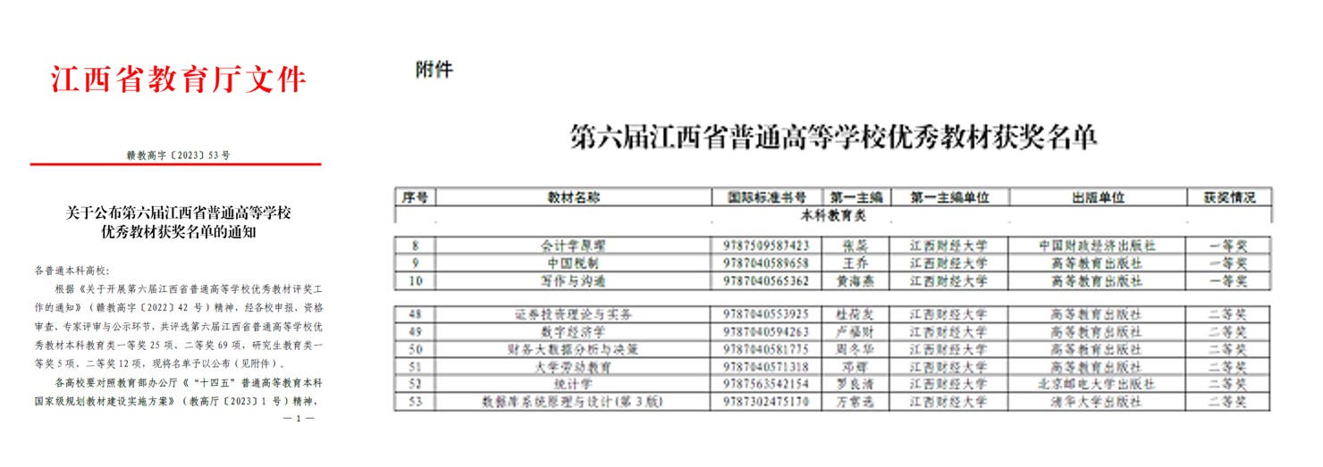 近日,江西省教育厅公布了第六届江西省普通高等学校优秀教材获奖名单,我校《会计学原理》等三部教材获本科教育类一等奖,《证券投资理论与实务》等六部教材获本科教育类二等奖。