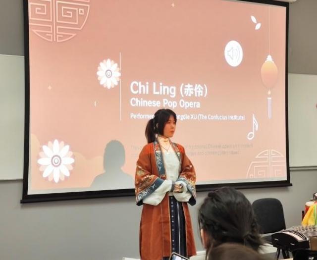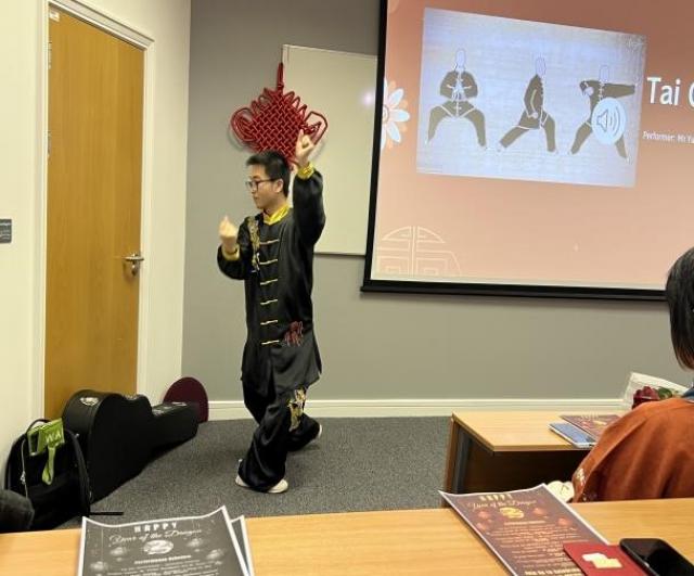 本次活动由法商学部副教授Qiaoyuan Lin和在读学生陈均灏主持。考大孔院的周禹老师用一场行云流水的太极表演拉开整场活动的表演序幕,孔院留学生志愿者徐梦蝶身穿汉服,一首《赤伶》向外国友人展示了中国传统戏曲与流行音乐的完美融合。在击鼓传花环节中,中外师生一起学说新年祝福语,一同挑战中文绕口令,妙趣横生。