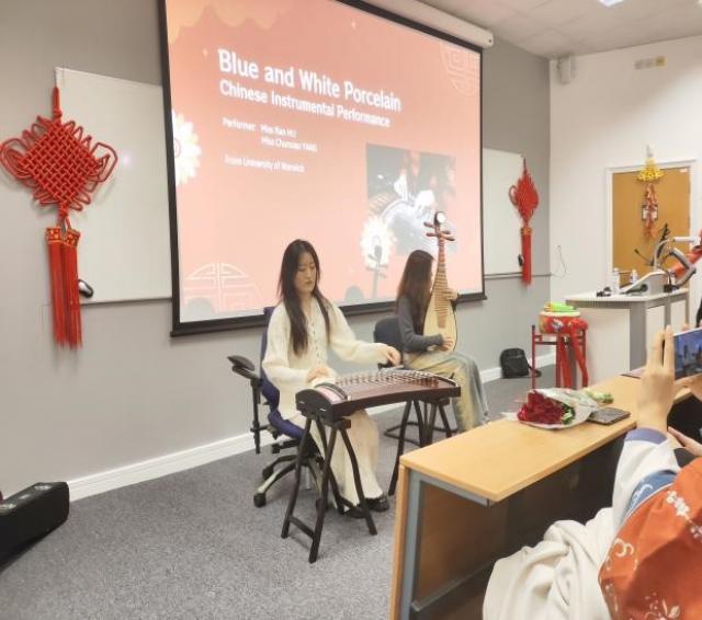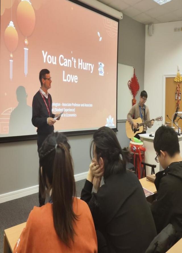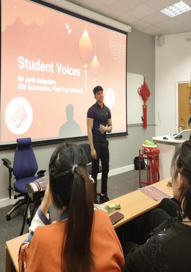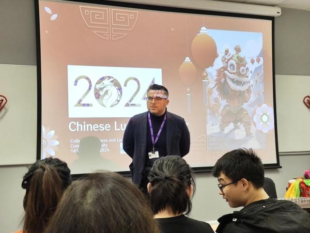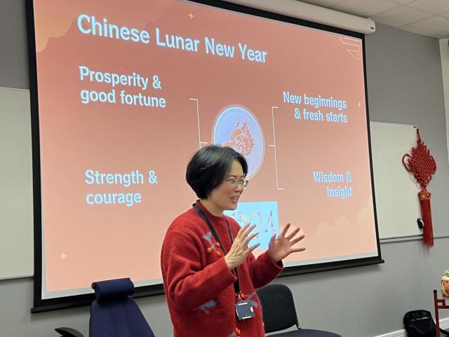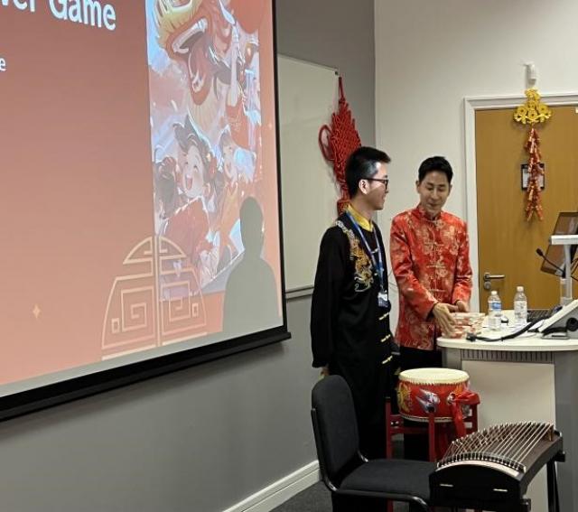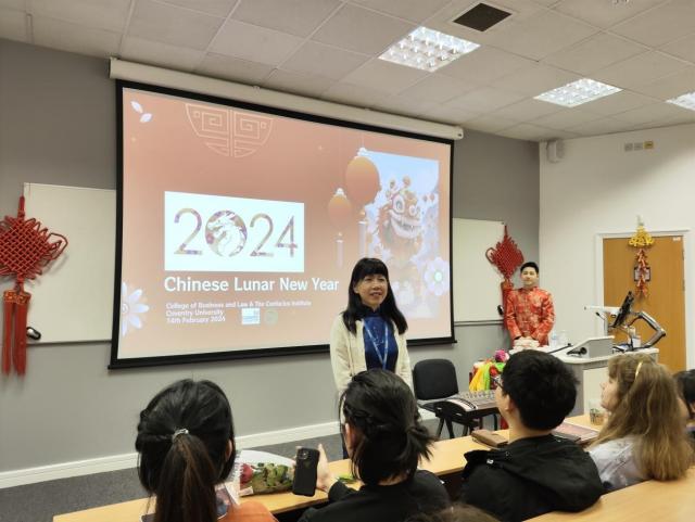 考文垂大学法商学部副部长George Hulene教授与考大孔院中方院长肖珑教授分别致辞。Hulene教授向与会嘉宾分享了自己和同事一起学说中文的趣事,同时也表达了对新的一年的美好祝愿,希望在校学生拥抱多元文化,发现中国新年的美好与价值。肖珑教授首先对受邀与商法学部联合举办中国新年活动表达了感谢,对活动筹备组织中辛勤付出的商法部同事表达了敬意。她为大家简要介绍了考大孔院及孔院提供的汉语相关课程,强调了孔院在构建多元文化,相互理解、包容与尊重的大学文化中所发挥的积极作用和独特价值,同时她也希望象征拼搏进取的龙年可以激励大家奋勇向前。