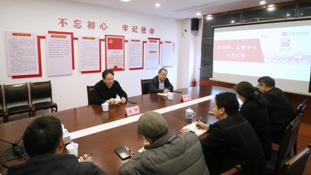 来到党委宣传部、文明校园促进中心,袁雄认真听取相关汇报,肯定了部门工作成效。他从学校宣传思想工作怎么做、如何呈现、如何被关注三个方面提出指导意见。在工作怎么做方面,一是要坚持社会主义办学方向,打好头阵。要讲政治,强化理论武装,提高“政治三力”。二是在社会主义办学方向的指引下,掌握正确的工作方法,做到事半功倍。三是弘扬正气、正能量,要有一种昂扬向上的工作姿态。四是为学校添光加彩,积极争取机会,创造条件,获得更多的荣誉。五是与全校各单位加强沟通、密切联系,做好学校重大工作。在工作如何呈现方面,袁雄要求从整体进行谋划,运用不同的宣传媒介,有选择性地筛选新闻,通过对新闻的再加工再创作,呈现出最好的新闻效果。在工作如何被关注方面,要坚持正确的舆论导向,首先让读者看到,其次通过内容、形式吸引读者,最后让读者深受感动。袁雄对党委宣传部、文明校园促进中心的队伍建设提出六点希望,希望大家成为党的理论武装和意识形态工作的号手,成为思想政治工作的能手,成为宣传策划的高手,成为文字工作的好手,成为文明校园建设的巧手,成为舆情处置的行家里手。