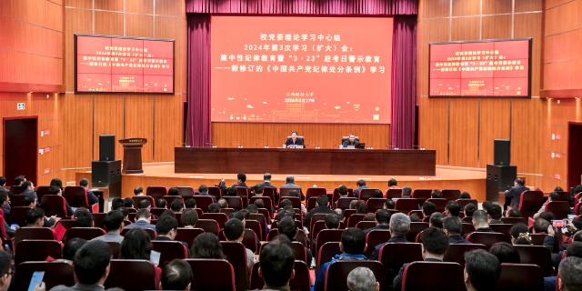 为进一步弘扬“赶考”精神,深入推进全面从严治党,筑牢党员干部思想防线,营造风清气正的政治生态。3月27日下午,校党委开展理论学习中心组第3次学习(扩大)会,进行集中性纪律教育暨“3·23”赶考日警示教育——新修订的《中国共产党纪律处分条例》学习。校党委副书记袁雄主持会议,会议邀请校党委常委、纪委书记、驻校监察专员顾有平作辅导报告。