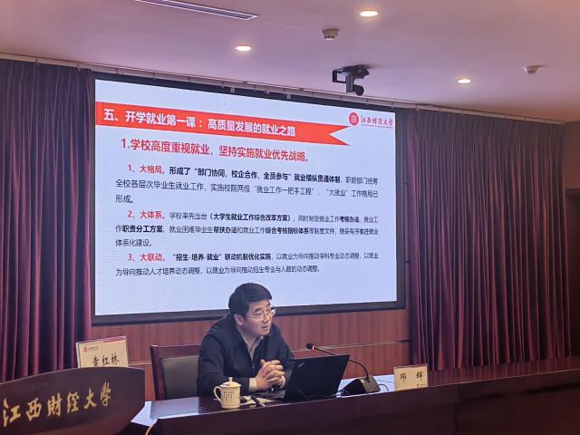 3月27日下午,2024年春季学期“开学第一课”在蛟桥园北区图文信息大楼二号报告厅开讲,校长邓辉教授以“学习贯彻两会精神,促进高等教育高质量发展——开启江财第二个百年高质量发展新征程”为主题讲授本次“开学第一课”。在讲授中,邓校长以“高质量发展的就业之路”为第一课的重要内容为在场的师生带来了一场精彩生动而富有启发性的就业之课。邓辉强调,学校高度重视就业工作,坚持实施就业优先战略,将就业工作视为一项极端重要的工作和最大民生工程。邓辉回顾了近年来学校就业工作方面所取得的显著成绩,将近三年的毕业去向落实率形象概括为“211”,即毕业去向落实率,一次位列全省第2,两次位列全省第1,并指出,学校目前已经形成了“部门协同,校企合作,全员参与”就业横纵贯通体制“大就业”格局;出台大学生就业工作综合改革方案、就业工作考核办法、就业工作职责分工方案、就业困难毕业生帮扶办法和就业工作综合考核指标体系等制度文件,推动了就业“大体系”建设。优化“招生-培养-就业”联动机制实施,建立以就业为导向的招生、培养、就业一体化的运行模式,凸显“大联动”机制,同时也分析了学校高质量发展背景下就业工作存在的问题及出路。邓辉表示,学校将进一步落实落细就业优先政策,把促进毕业生就业工作摆在更加突出的位置,在访企拓岗、就业能力提升、服务优化等方面推出更加具体的行动和举措,千方百计促进我校毕业生高质量充分就业。同时希望同学们要争做高质量成长成才的开拓者和实干家,了解产业、行业和职业变迁,增强识变、应变、求变的意识和能力,学成之后,留在江西,服务江西。