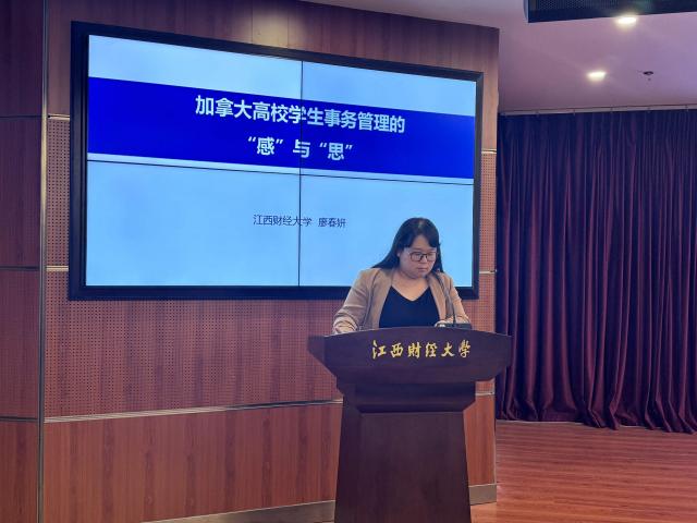金融学院党委副书记廖春妍以加拿大高校学生事务管理的“感”与“思”为主题,分享了其入选2023年高校思想政治工作骨干出国访学研修项目,作为访问学者赴加拿大阿尔伯塔大学访学的经历和体会。