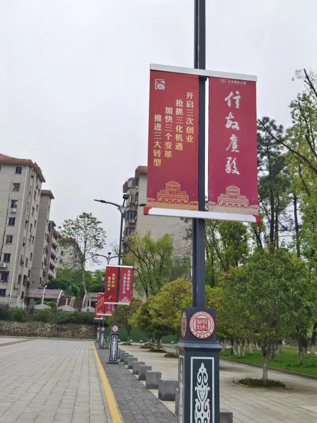 “开启三次创业,抢抓三化机遇,加快三个变革,推进三大转型”,阳春四月的校园里,更换一新的道旗标语格外醒目。为落实“三次创业”总任务,4月12日上午,文明校园促进中心组织校园环境督查,对校园环境秩序、卫生保洁、宣传物品进行全面“体检”。