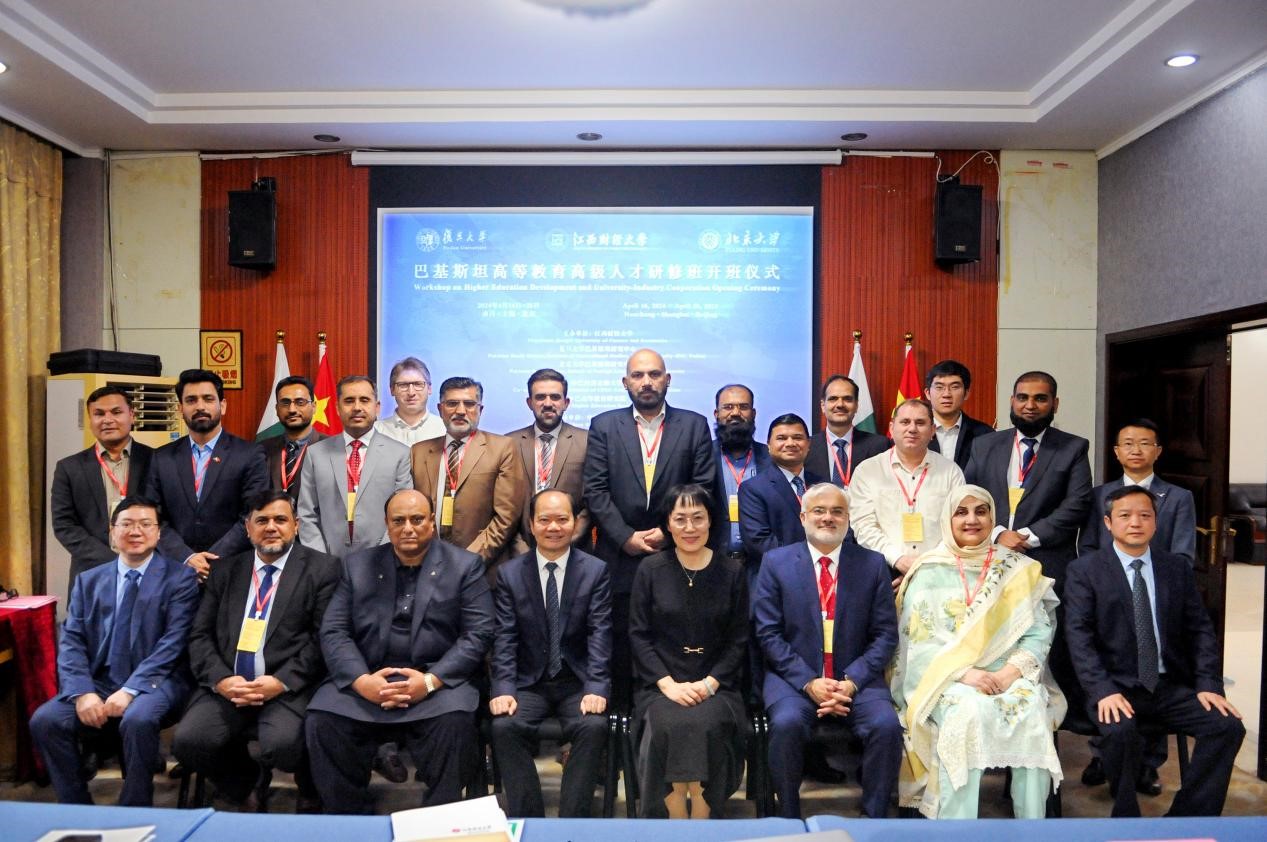 4月16日上午,由我校国际经贸学院、复旦大学巴基斯坦研究中心和北京大学巴基斯坦研究中心主办,中巴经济走廊大学联盟秘书处和中巴高等教育研究院协办的巴基斯坦高等教育高级人才研修班顺利开班。副校长李春根、中国高等教育学会秘书处学术与交流部主任高晓杰受邀出席开班仪式并致辞,复旦大学巴基斯坦研究中心主任章节根、我校国际合作与交流处副处长刘小兵以及来自巴基斯坦的16名学员参加了仪式。活动由国际经贸学院院长吴朝阳主持。