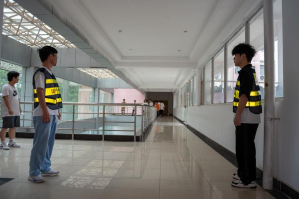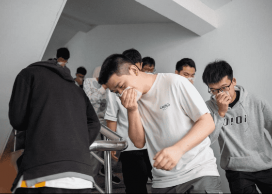 接到疏散指令后,同学们纷纷用湿毛巾捂住口鼻,严格遵循预定的疏散路线,俯身降低身体重心,有序撤离宿舍楼,在安全地带迅速集结完毕。整个演练过程紧张而有序,同学们表现出了良好的应急反应能力和团队协作精神。