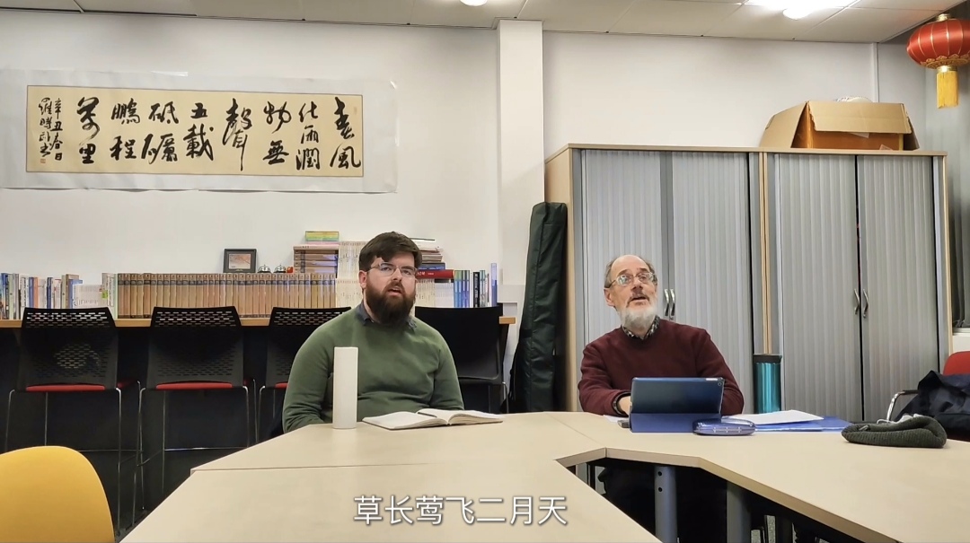 另一边,大家围着公派教师马殊亮,专著地看着古诗展板,跃跃欲试。他们首先选择一首自己喜欢的古诗,在马老师为他们解释意义之后,开始尝试朗读,感受中国古诗的韵律和形式之美。尽管他们中大多没有学过中文,但是不乏说得很好的学生,他们也借此机会,扩展了自己的兴趣,了解了考大孔院的夏季课程,决定正式学习汉语。