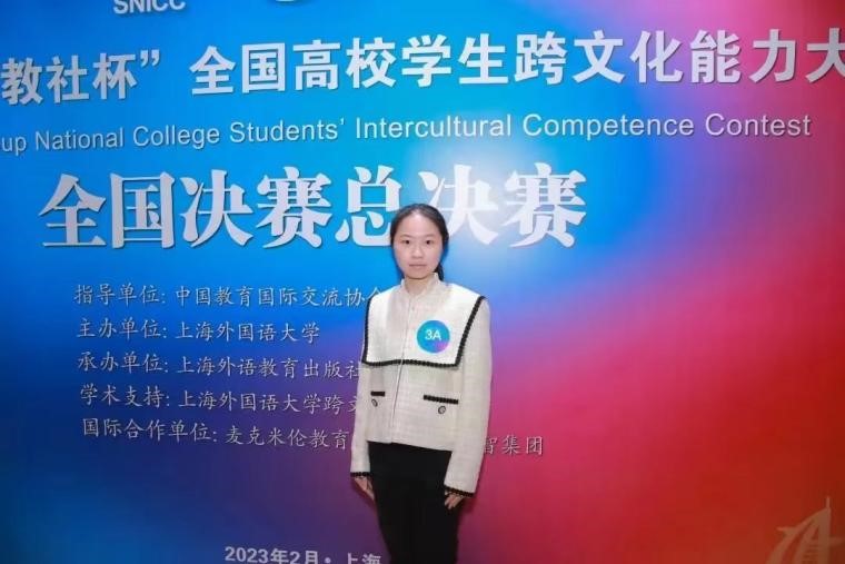 她热爱英语,同时也积极参加各类英语竞赛和考试,取得的奖项和成绩有:“外教社杯”英语跨文化能力大赛全国总决赛二等奖、省一等奖,连续两届“燕兴杯”江西省英语应用能力比赛一等奖,雅思7分(其中阅读8.5分)。