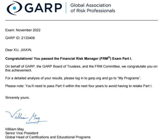此外,她还在大三通过了FRM(金融风险管理师)一级考试,其中Foundations of Risk Management(风险管理基础)、Quantitative Analysis(定量分析)、Valuation and Risk Models(估值与风险模型)三门科目全球排名前25%。这个考试的内容高度契合她的本科培养方案,巩固了她的专业知识和英语能力,为大四一战北大奠定了知识基础。