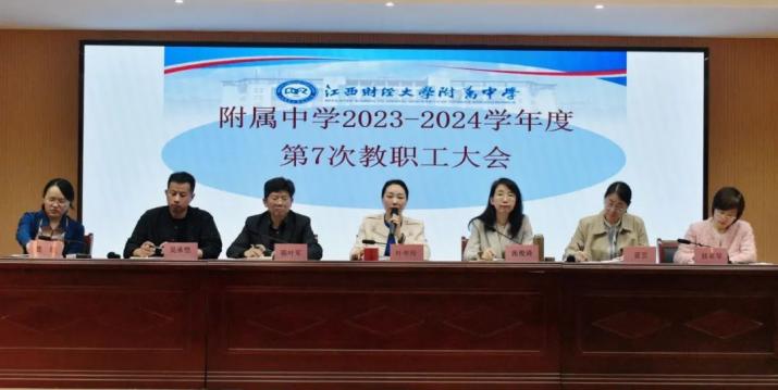 近日,附属中学全体教职工齐聚蛟桥园知行楼报告厅,召开2023-2024学年第7次教职工大会。附中党总支书记叶申玲、校长张俊琦及全体教职工参加本次会议。