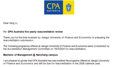 经澳洲总部审批,国际学院于4月26日接到澳洲会计师公会(CPA Australia)官方正式通知,会计学(国际会计)专业方向通过了澳洲会计师公会的再认证。此轮再认证是澳洲会计师公会对该专业方向自2015年首获认证并近十年定期续认证以来,在人才培养、师资建设、课程建设以及国际合作等方面所取得成果的一次全面综合性审核。国际学院在2023年秋季接到官方再认证的通知后高度重视,精心制定了认证工作方案,组织配备力量,准备了最新人才培养方案、课程大纲、课后作业和试卷样例、毕业生就业和用人单位反馈等一系列材料,并经由专家多次讨论、评审和修改,确保了再认证工作的顺利进行和圆满完成。