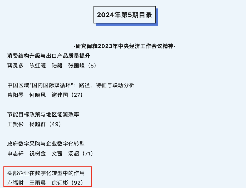 近日,应用经济学院(数字经济学院)卢福财教授与其指导的博士研究生王雨晨、博士徐远彬在我校权威期刊《数量经济技术经济研究》(2024年第5期),发表题为《头部企业在数字化转型中的作用》的论文。该论文为国家社会科学基金重大项目“数据要素驱动经济增长的理论与政策研究”(项目编号:23&ZD073)的阶段性研究成果。