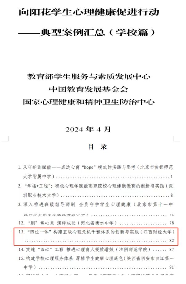 目前全国共有23所学校入选,其中高校9个,我校是江西省唯一。据悉,该项活动是由教育部学生服务与素质发展中心于2023年10月27日在京正式启动,该行动将分阶段开展教师培训、科普宣传、课题研究、案例遴选、心理援助等工作,旨在通过“医教协同”新机制,塑造学生心理健康新动能,夯实学生德智体美劳全面发展的心理基石。(图文/学工处 欧阳普勇 编辑/李贵超 审核/一审 姜莹 二审 赵旻 终审 李大晖)