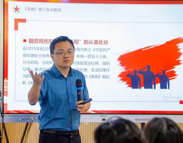 邢小明为全体毕业生党员上了在校的最后一堂党课,他详细解读了最新修订的《中国共产党纪律处分条例》,强调了党员的基本义务和要求,他希望各位党员同志离校后要时刻谨记党员身份,要做到认真学习、深刻领悟、准确理解、严格执行,自觉将自律要求内化于心、外化于行。他寄语所有毕业生党员能够成为心中有梦、眼中有光、手中有活、脚下有力、肩上有责的时代新人,在青春的赛道上争取跑出当代青年的最好成绩,在民族复兴的伟大征程中实现人生理想。