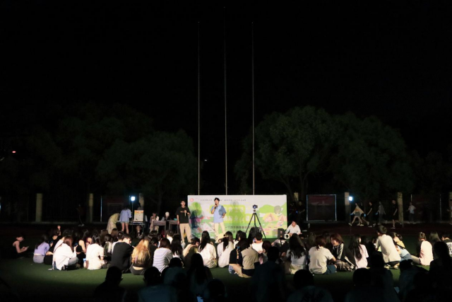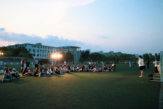 傍晚时分,“音梦人文,绿野放歌”环节如期而至,为现场观众带来了一场精彩绝伦的视听盛宴。随着夜幕的降临,操场上逐渐聚集起了越来越多的同学们,他们或坐或站,期待着即将上演的精彩节目。