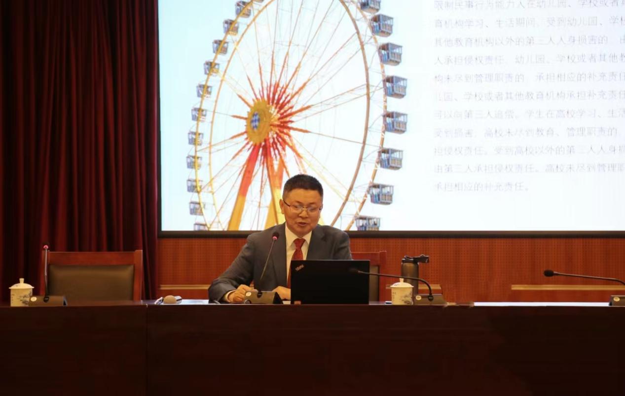 蒋春律师以大学校园安全问题司法案例为切入点,详解法律知识点,分享案例的裁决思路,敲响了安全警钟。李晓茂律师以《民法典》在高校的应用为主题,从学校教育管理职责入手,详细讲解了校园人身损害侵权责任划分,以及名誉权、隐私权等侵权案例。