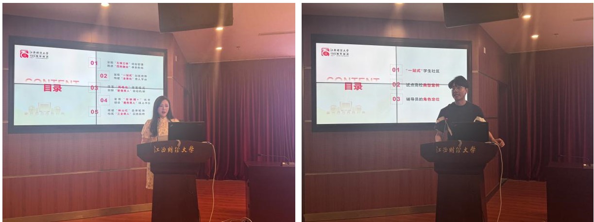 会上,学工部(处)匡仁相领学了近期习近平总书记系列重要讲话精神和党纪学习教育辅导材料。设计与艺术学院刘歆玮、虚拟现实(vr)现代产业学院王涛分享了参加在武汉举办的全国“高质量推进高校‘一站式’学生社区建设与管理模式创新研修班”的学习体会,并会上介绍了我校“一站式”学生社区建设的工作经验,说明了“辅导员”在“一站式”学生社区建设中承担的重要角色。
