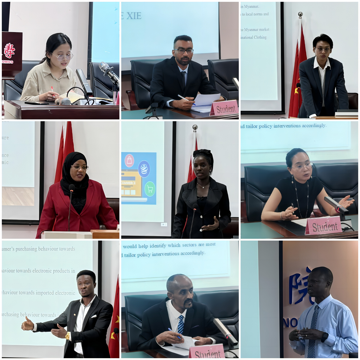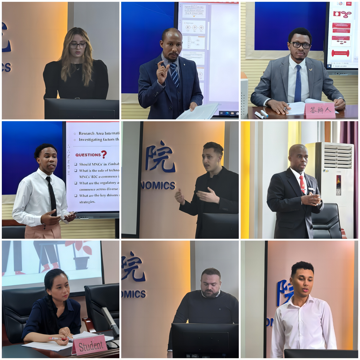 本次答辩分为十二组,共有来自尼日利亚、委内瑞拉、埃塞俄比亚、柬埔寨、摩洛哥等35个国家87名国际商务专业留学生参加。30余名2023级国际商务专业在读留学生旁听。