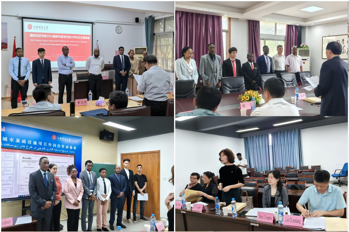 5月23、24日,国际经贸学院组织的学校2024届国际商务专业来华留学生硕士学位论文答辩会在翼珍楼成功举行。答辩委员会主席分别由江西师范大学陈绵水教授、南昌工程学院王自强教授、南昌大学戴志敏教授和华东交通大学李冬伟教授担任,副校长袁红林教授、经济学院王小平教授、海外教育学院院长黄先明教授、外国语学院院长张曦凤教授、国际经贸学院院长吴朝阳教授、许统生首席教授参加此次答辩会。